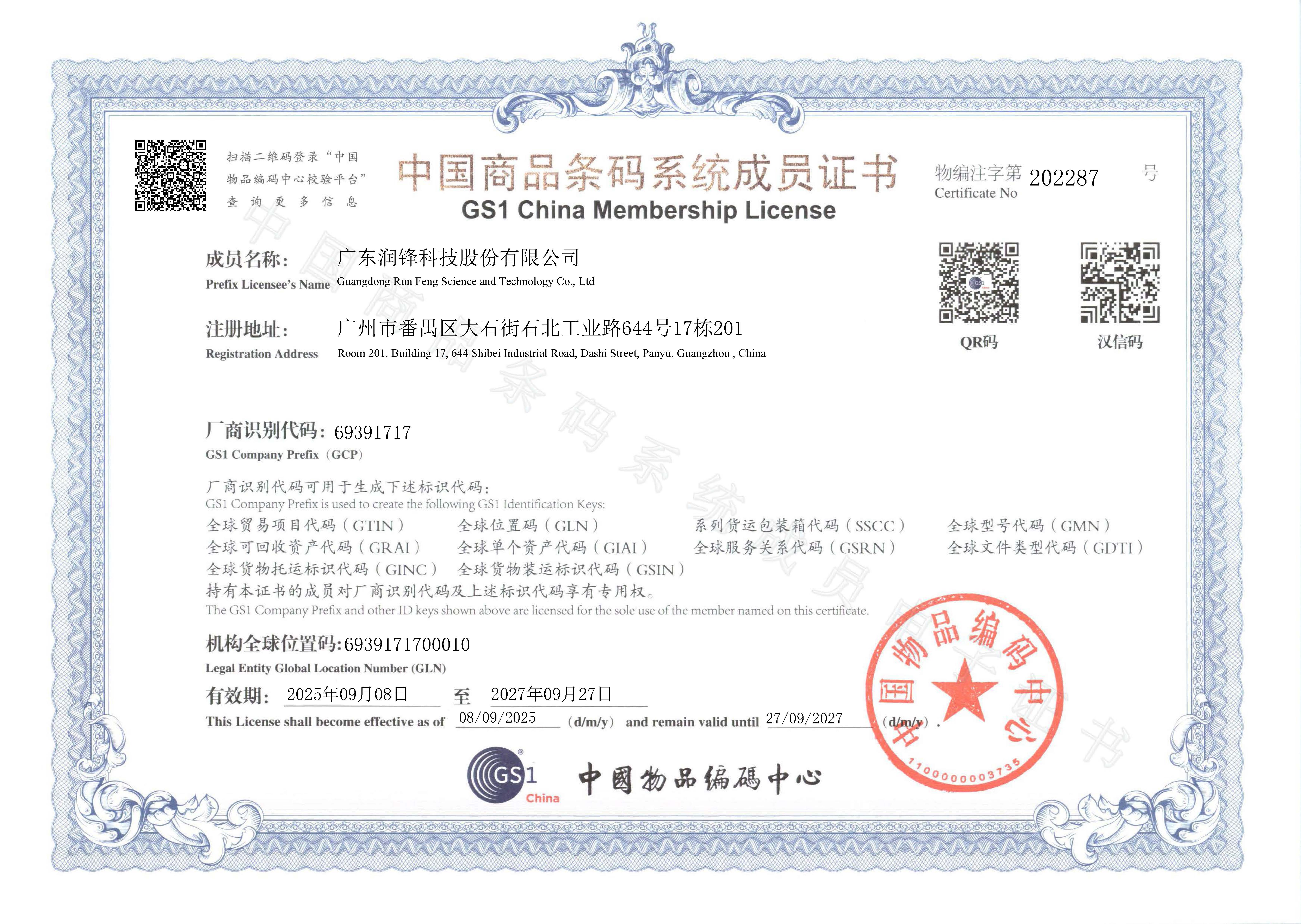 商品条码系统成员证书